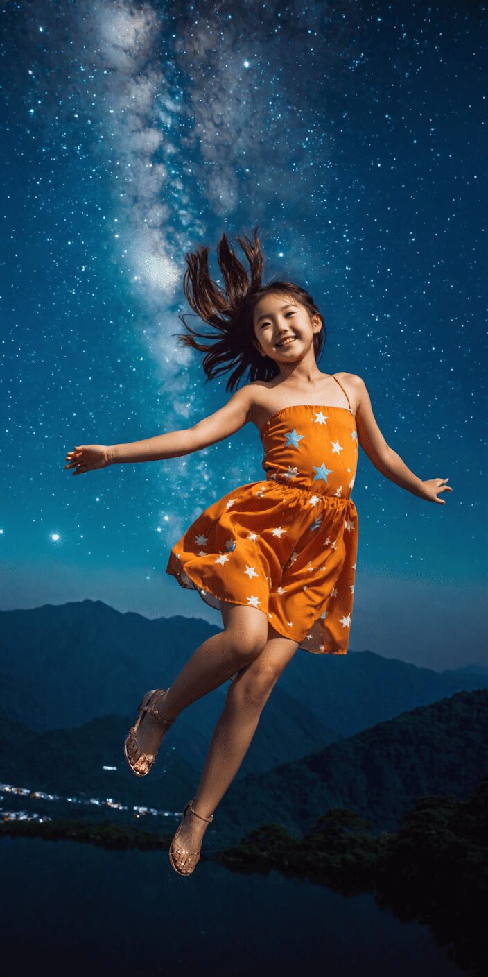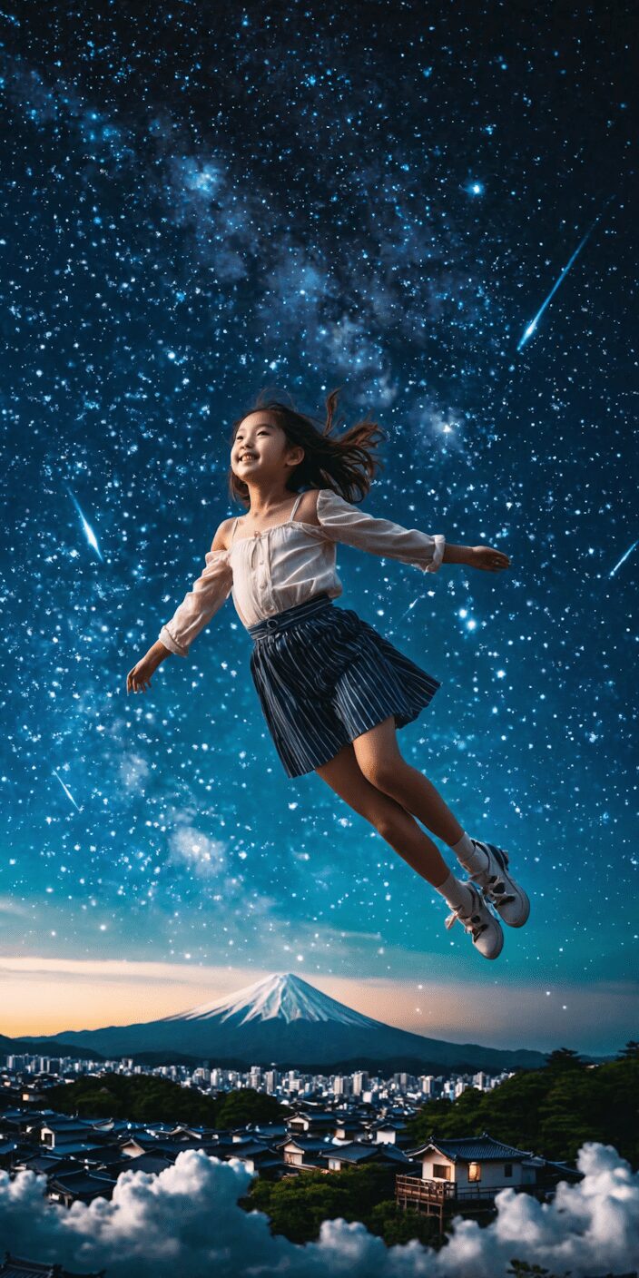 星空を翔ける少女。とても幻想的な雰囲気ですね。 A girl soaring through the starry sky. It has a truly fantastical atmosphere.
